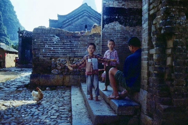 山脚下的老房子,门前是石头铺的小路。两个孩子站在院门口
