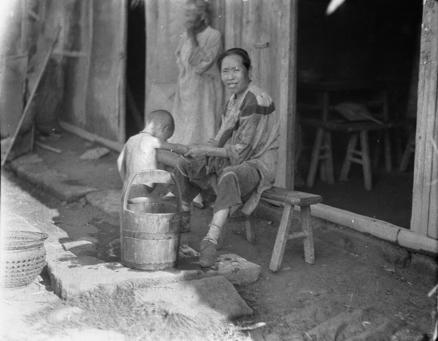 坐在门口边带小孩边的=干活的小脚妇女们。