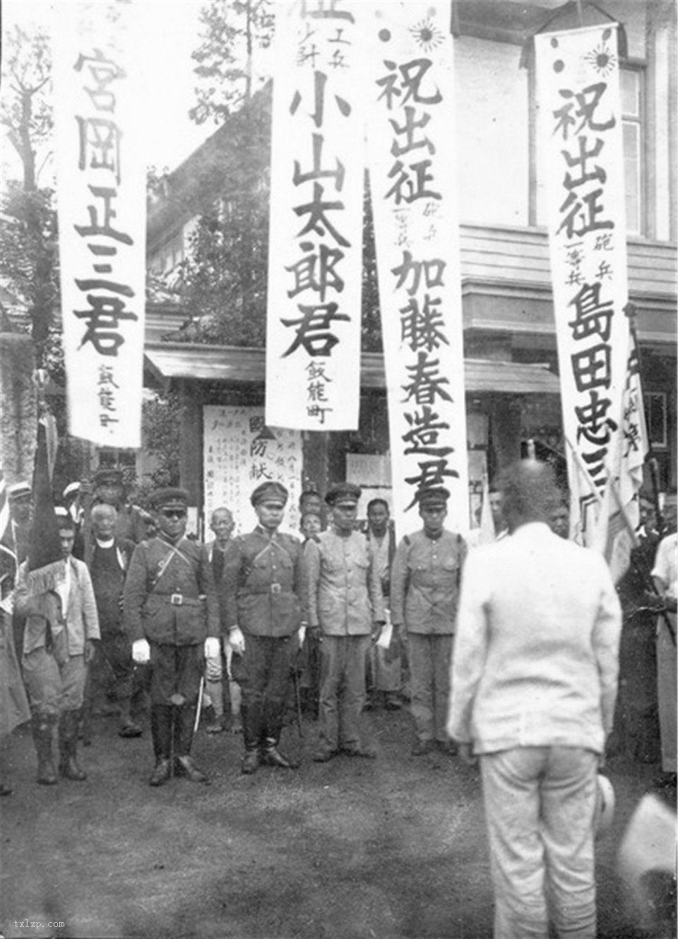 这一组照片的主角是一个叫小山太郎的日军少尉,他参加过侵华战争,这10张照片记录了他从入伍到被八路军击毙全过程。图为出征前欢送仪式上的小山太郎,这一年他34岁。