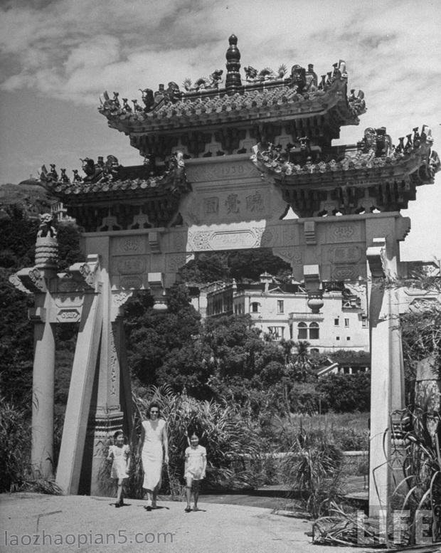 1945年9月,香港,中国美女和孩子在何东夫人纪念堂之晓觉园,这里是香港大学最古老的建筑之一。
