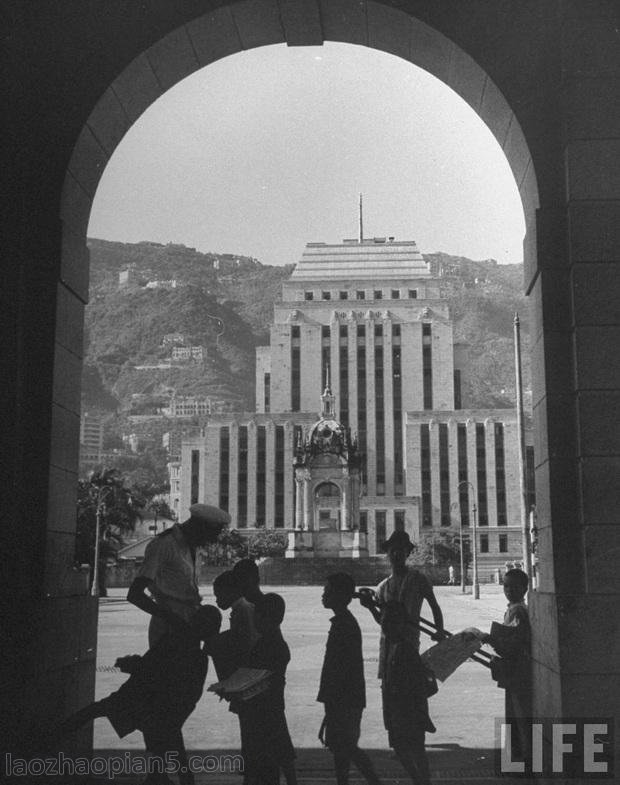 1945年9月,香港。从一处拱门看香港汇丰银行大楼。