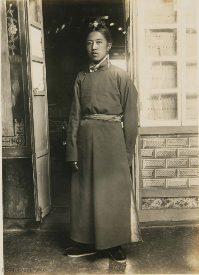 一个西藏上流家庭的青年,发髻上有金玉首饰,手上有扳指