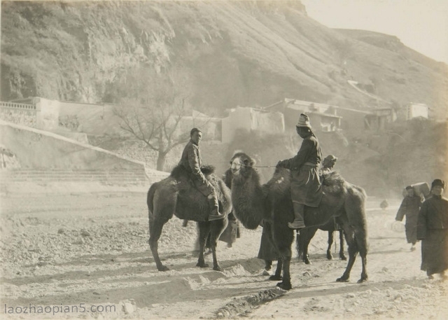 张家口的长城外,一个老汉牵拉着一头带着笼头的黑骡子,上面坐着一个裹脚妇人