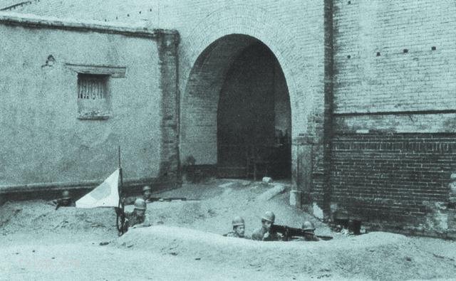 (1937年10月3日,日军占领山东德州北部的桑园镇,城门前警戒的桑田部队士兵)