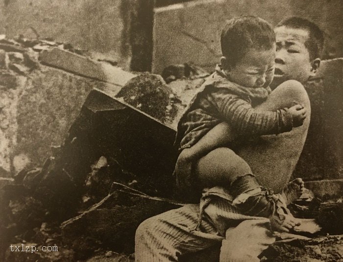 摄于1943年,日军对河北易县的狼牙山区进行扫荡,一个男孩在废墟之上抱着她年幼的弟弟,他们的父母已经被日军残忍的杀害。