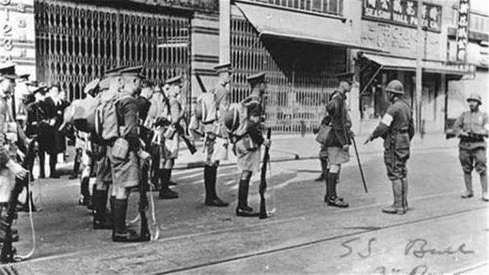 英国士兵在日军占领上海后在街道上被日军拦住。他们双方在街头对峙。
