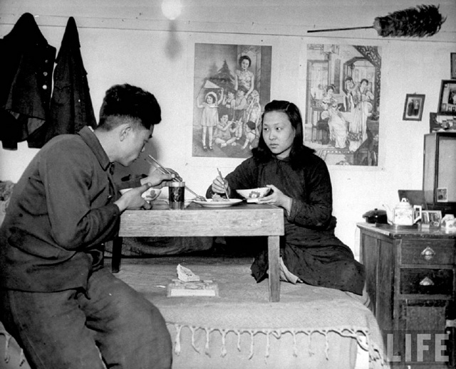 1946年4月,张家口。从良的JI女坐在剪纸窗前纳鞋底