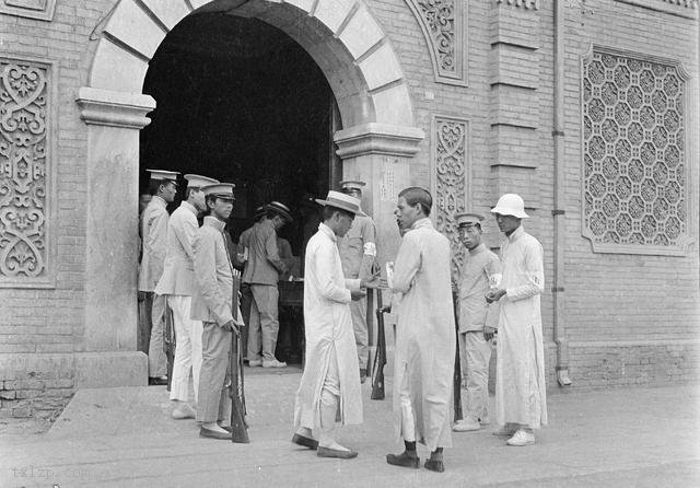 图为1919年6月3日,北京基督教青年教会门前,北京大学讲演团的学生与骑警。