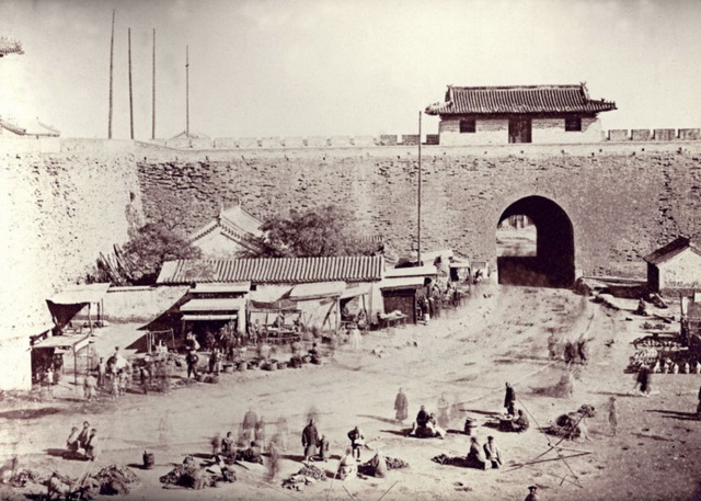 1865年北京,宣武门城门附近。元代叫顺承门。位于正阳门以西,俗称“顺治门”。1921年拆除箭楼及关帝庙,1930年拆瓮城。1965年城楼拆除。