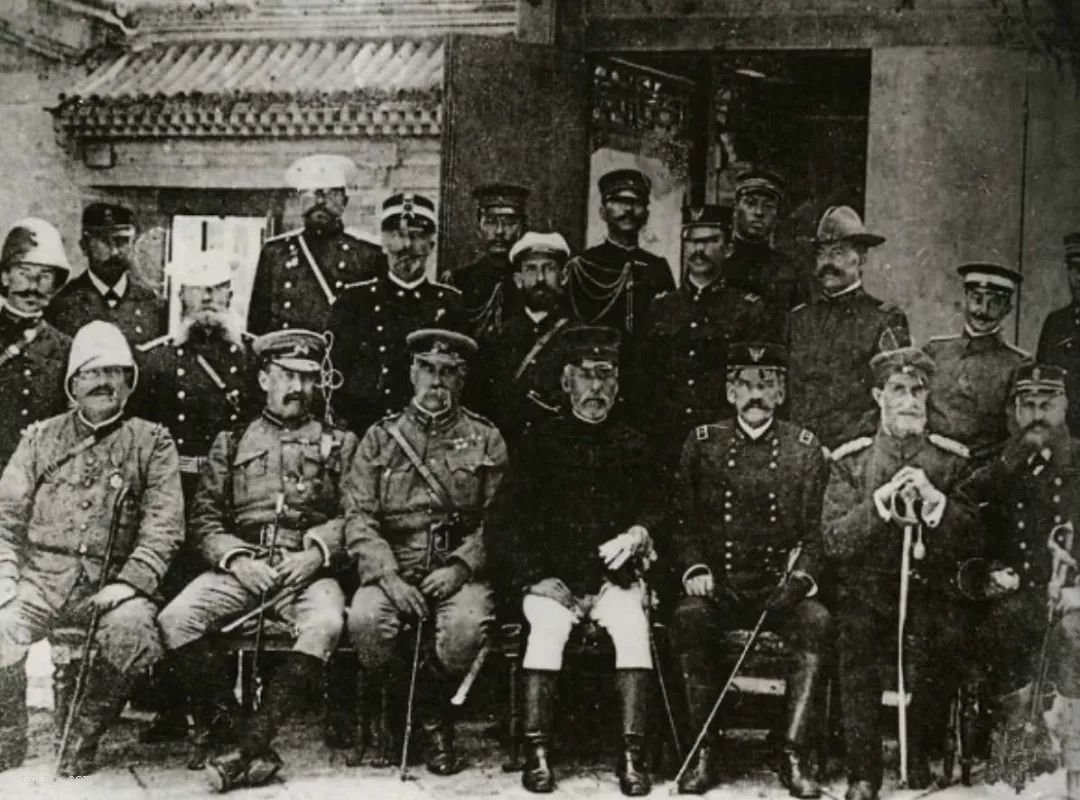 1900年5月28日,英、美、法、德、俄、日、奥、意八国在各国驻华公使会议上正式决定联合出兵镇压义和团,以“保护使馆”的名义,调兵入北京,清政府被迫同意。图为八国联军的军官在当时的日本领事馆的合影。
