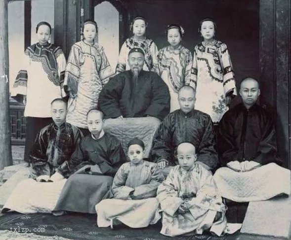 图为晚清一个富人家的老爷和他的几位妻妾以及儿女。