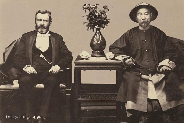 那时的清政府闭关锁国,但李鸿章的思想还是比较超前,他知道一直这样肯定是不行的,一定要学习西方先进的东西。这张照片就是李鸿章和格兰特的合影,这个人曾经是美国的总统,是美国南北战争中的英雄。