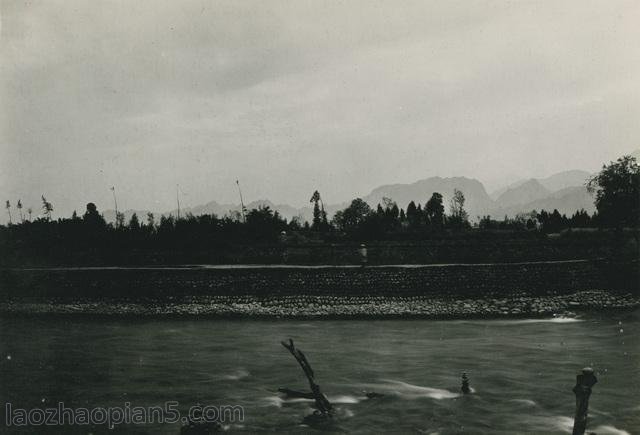 考察团终于在傍晚时分来到灌县的县城,这是罗林在走马河畔拍摄的灌县城外风光,河流流向成都平原,灌县背靠着连绵不断的大山,对岸的一座宝塔是奎光塔。