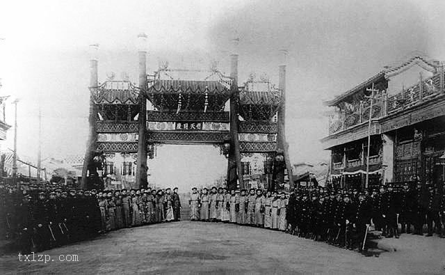 照片中是溥仪溥仪登基大殿前守候在大清门前的太监们,正在恭候溥仪登基。