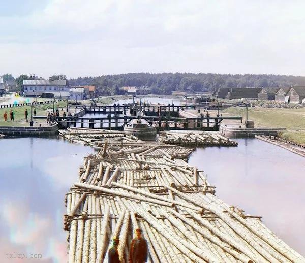 彼得大帝运河(Peter the Great Canal)上的木筏。位于列宁格勒州,什利谢利堡市(Shlisselburg)。摄于1909年。