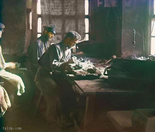卡斯利(Kasli)铁工厂的铸模工人。位于叶卡特琳堡(Ekaterinburg)和车里雅宾斯克(Cheliabinsk)之间乌拉尔山脉(Ural Mountains)铁矿石地区。鼎盛时期,全厂工人超过三千人。摄于1910年。